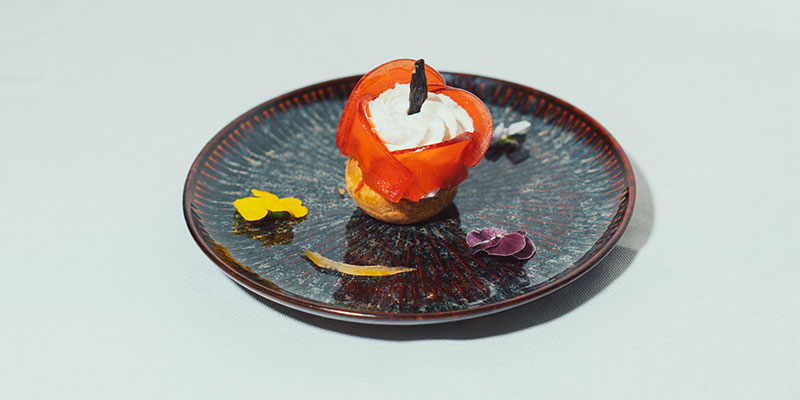 Ce dessert appelé "La Pomme de Camille" a été réalisé par Camille MICHEL. Il est inspiré de l'œuvre Le Chien savant de Jean-Honoré Fragonard et est composé d'un chou, d'un craquelin, d'une compotée de pommes caramélisées, d'une crème chantilly à la verveine et d'une pomme sirop.
