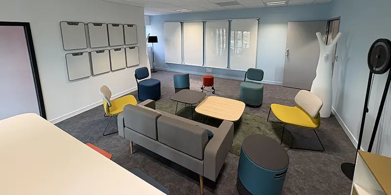 - 1 salle de créativité de 40 m² comprenant : 1 écran de projection, des fauteuils et canapés, du mobilier modulaire, des tableaux blanc, des tables basses, une table haute. Accès prise électriques et wifi