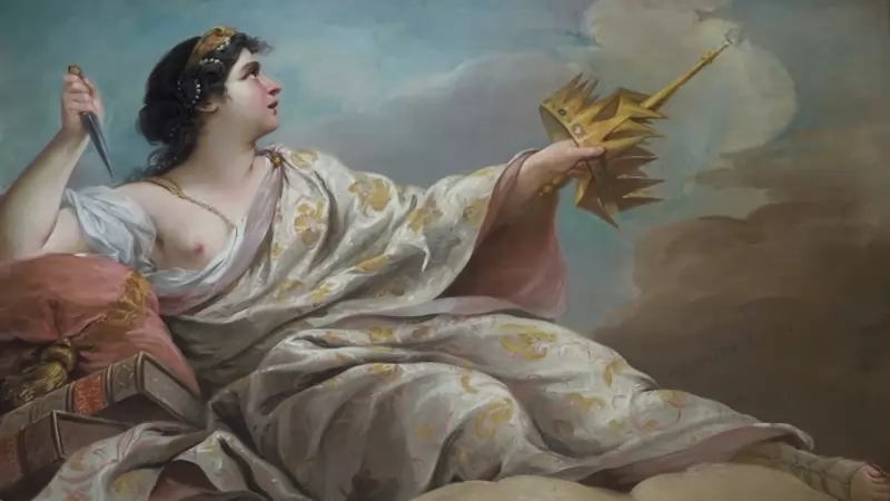 Ensuite, nous avons la tragédie représentée par la muse Melpomène, qui a sous le bras les oeuvres de Racine et de Corneille, qui tient également un poignard dans une main, et le sceptre et la couronne dans l'autre main, ce qui symbolise le pouvoir.